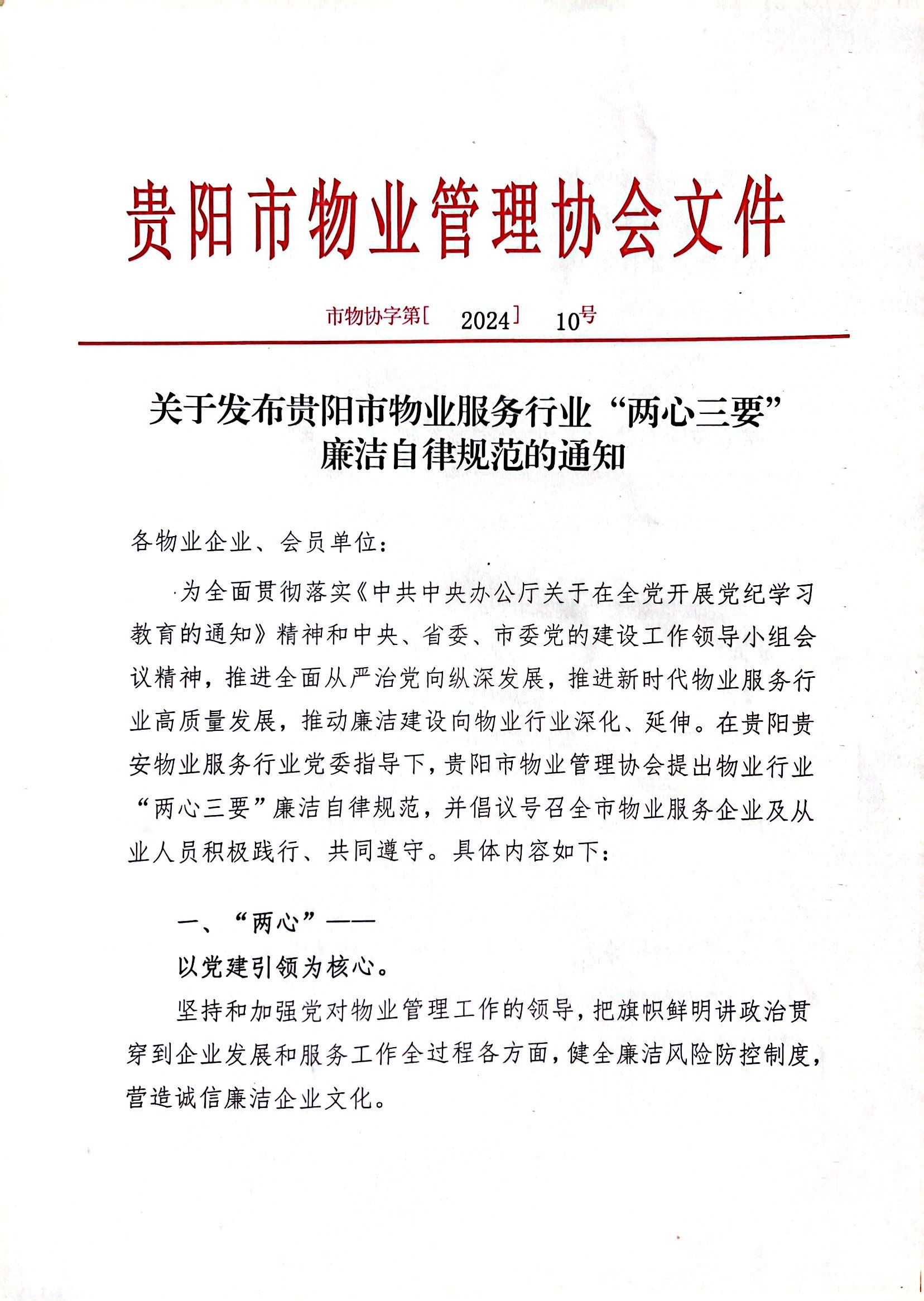 市物协字第[2024]10号 关于发布贵阳市物业服务行业“两心三要”廉洁自律规范的通知 会员服务 通知公告 会员展示 会员名录 会员动态 关于发布贵阳市物业服务行业“两心三要”廉洁自律规范的通知 发布时间:2024-05-10 发布单位:贵阳市物业管理协会 阅读量: 0 次 点击下载:市物协字第[2024]10号 关于发布贵阳市物业服务行业“两心三要”廉洁自律规范的通知 Posted in 通知公告.